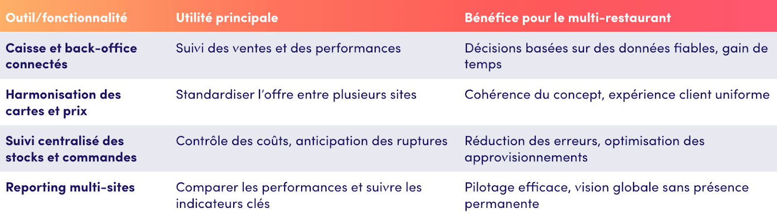 Pour piloter efficacement plusieurs restaurants, voici les principaux outils à mettre en place, avec leur utilité et les bénéfices concrets pour votre activité.