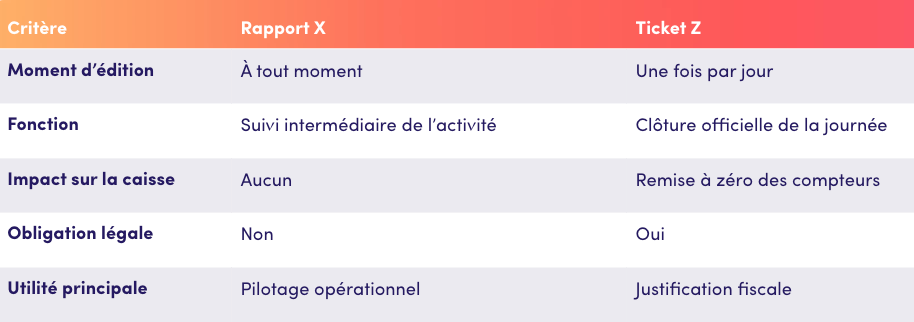 En résumé : le X permet d’analyser votre activité en cours de journée, le Z permet de clôturer votre journée de caisse.